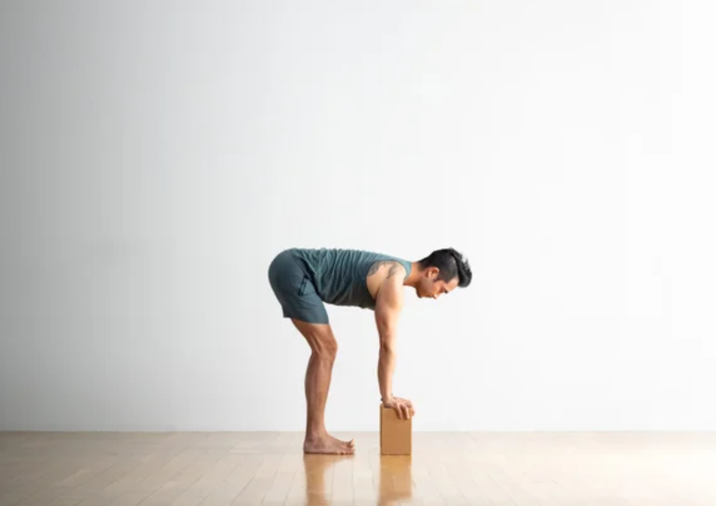 Walk your feet to the front of your mat, bringing yourself into a Forward Fold. Place the blocks under your hands to bring the floor closer, which helps reduce strain on your hamstrings. Allow your head to hang heavy and relax, letting go of any remaining tension.