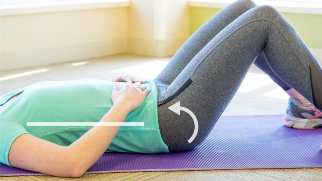 - Pelvic Tilts: Sit on a chair, leaning slightly forward, then lie on your back on the floor with your knees bent. Move your pelvis gradually upwards and downwards while bringing your awareness to the curve of your spine and the flattening on the lower back.