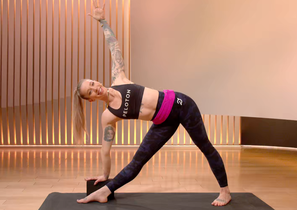 In Triangle Pose, the block offers the stability needed to keep proper alignment, which also deepens the stretch on both sides of the body.