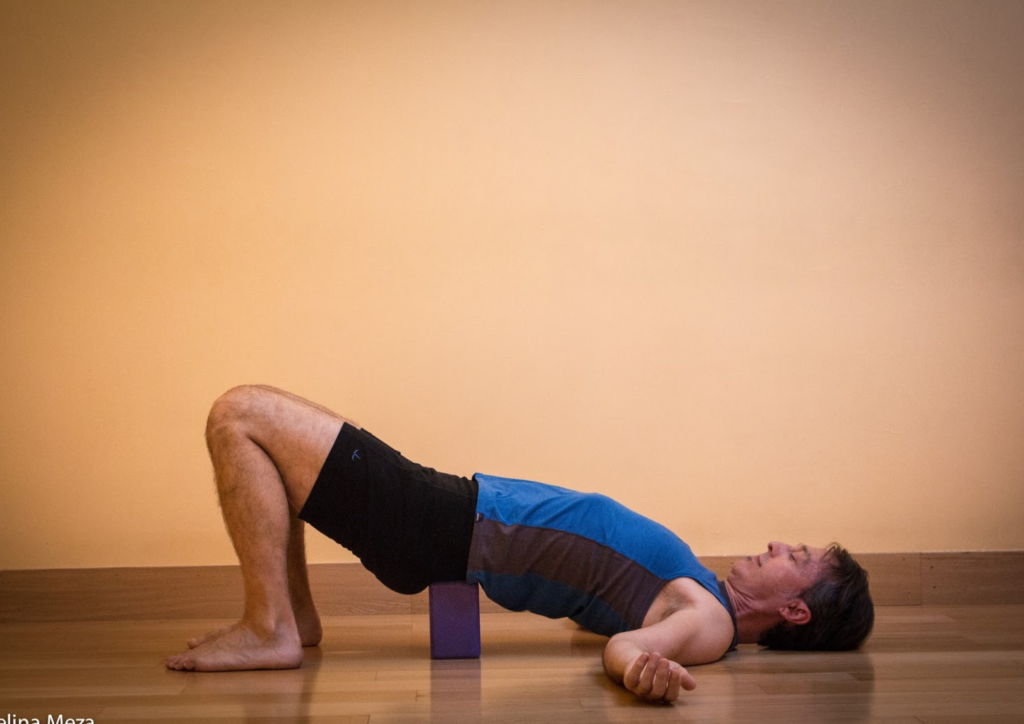 Adding a block under the sacrum in Bridge Pose transforms it into a more restorative posture, ideal for winding down.